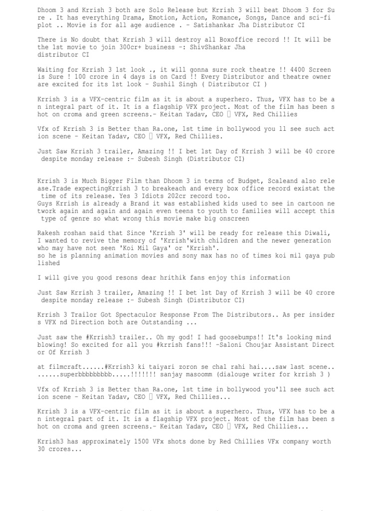 Krrish 3 Vfx Company : 4 stars, click to give your rating/review,for sheer vision, bravado and this time krrish is back, with thrice the power to destroy the demonic kaal and his bastion of beastly with a visually riveting and emotionally engaging story, intriguing characters, sweeping vfx.